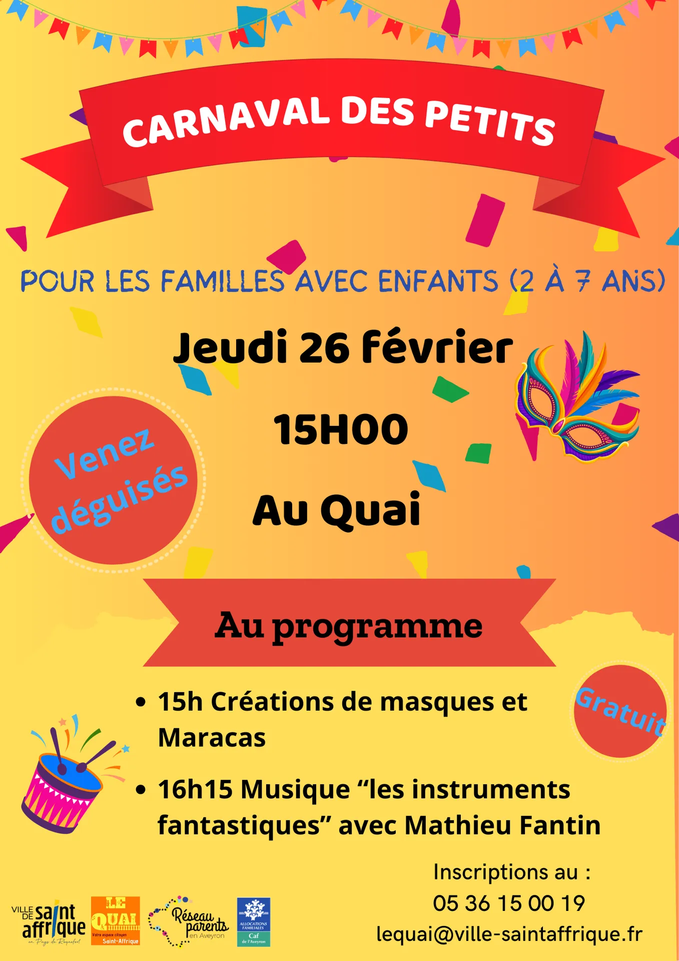 Masques colorés, musique magique et rires d’enfants… Le Carnaval des Tout-Petits arrive ! Venez partager un après-midi festif et créatif avec vos enfants de 2 à 7 ans !